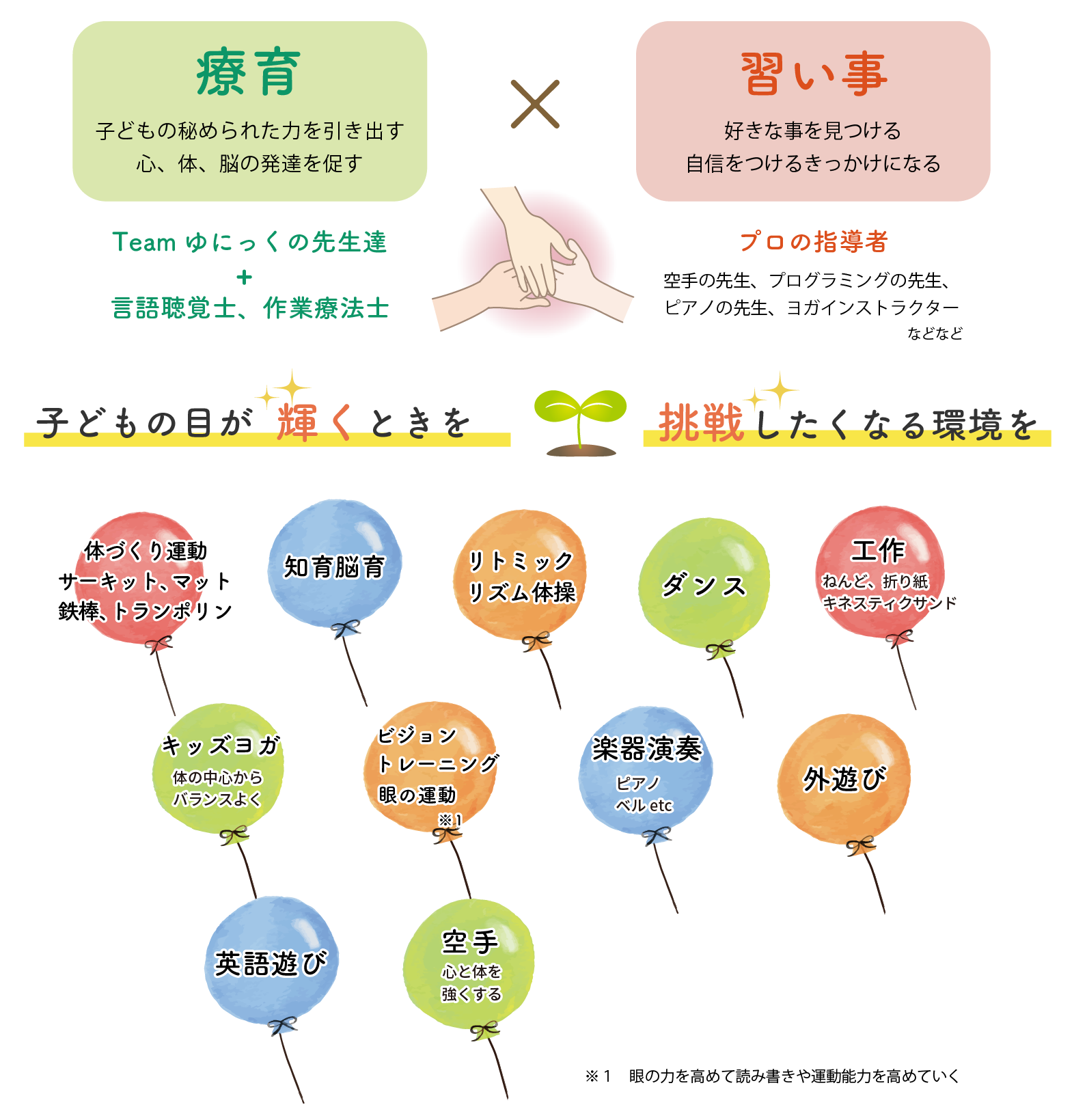 一人ひとり自分らしさ(個性)を持って生まれて成長していくものだとおもいます。そんな子ども達に出会えた事に感謝と愛念の気持ちを込め「ゆにっく」=(唯一無二)と命名させてもらいました。 発達の弱さやこまりごとへの答えはインターネットや本の中にはありません。子ども自身の中にあります。